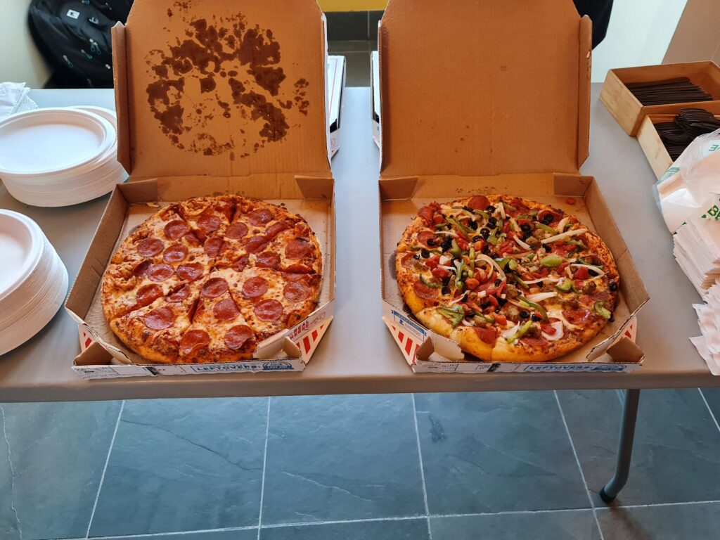 Nach der Probe, folgten wir den UPS-Studierenden zu dem Ort, an dem uns Pizza erwarten sollte, welche nur kurz auf sich warten ließ. Sobald das kostbare Gut dann da war, konnte sich jeder bedienen, der es bis vorne an die lange Schlange geschafft hatte.