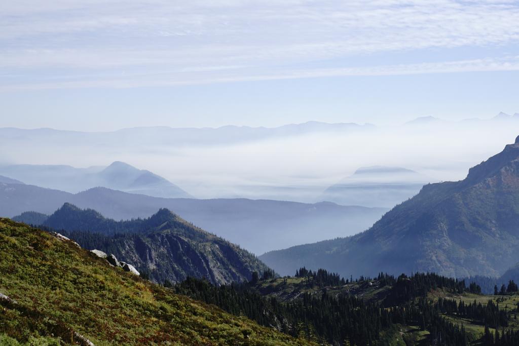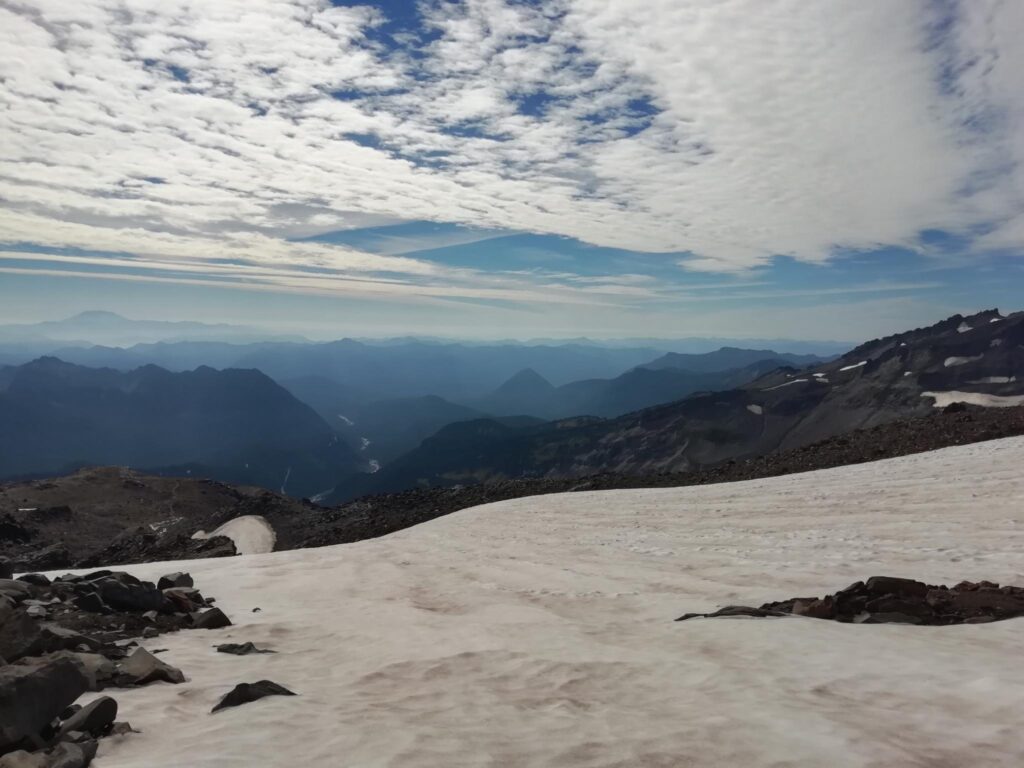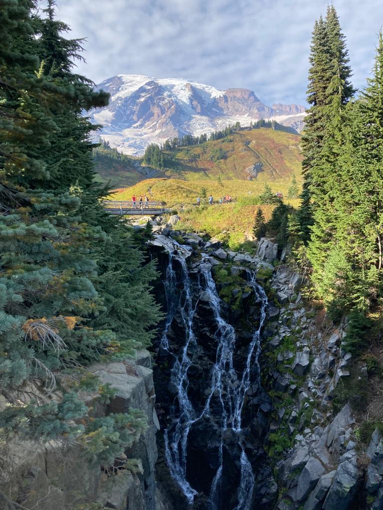 Der Berg mit 4392 Metern Höhe erschien exponiert und einsam in der Landschaft. Die Vorfreude, diesen Berg zu erklimmen, stieg erheblich. Während die einen ein power nap zur Stärkung vor der Wanderung abhielten, konnten sich die anderen an den Veränderungen der Vegetation erfreuen – vom Laubwald über den Nadelwald bis hin zur Baumgrenze. Der Bus brachte uns über kurvige Landstraßen sicher auf 1600 Meter Höhe, wo sich unser Startpunkt – Paradise Inn – befand. Schnell formierten sich Kleingruppen mit verschieden ambitionierten Zielen für den Tag: Die einen wanderten über recht flaches Gelände zu Wasserfällen, die nächsten liefen den sogenannten „Skyline Trail“, ein 10 km langer Rundweg mit 600 Höhenmetern, andere konnten es nicht lassen, bis auf die Gletscher zu steigen.