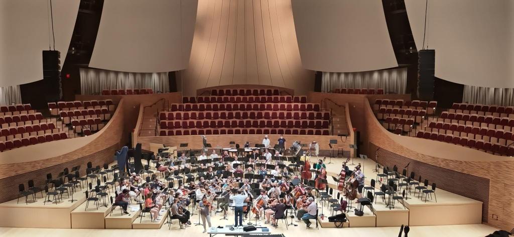 Gestärkt folgte die erste Probe mit dem Orchester der Stanford University in der Bing Concert Hall. Mit der Wuchtigkeit des riesigen Orchesters von über 160 Musikerinnen und Musikern fegte es den amerikanischen Stanford-Dirigenten Paul Phillips bei Jurassic Park fast vom Podium. Gekonnt leitete er die gemeinsame Probe zweisprachig.