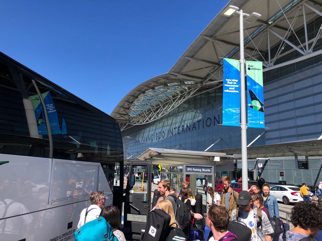 Alamo Square mit Aussicht. In der Sonne dösen bis Pizzaduft weckt. Im Futtern die Hiobsbotschaft: Erster Bus fährt in 11 Minuten. Die Pizza ist sofort Geschichte und wird gegen Menschen eingetauscht. Die eben noch dösende Masse: jetzt eine körperlich und emotional bewegte Menge. Es ist ein Sich-in-den-Armen-Liegen, Abschiedsworte-Verstreuen und Diese-Zeit-jetzt-schon-Vermissen. Ein Trauern ob des Hinter-sich-Lassens dieses Lebens der letzten 2.5 Woche, das doch schon der neue Alltag geworden war: Sorglosigkeit, Leben im Moment, von Ansage zu Ansage, so viel Musik, fantastische Städte und Natur(en) und vor allem: das Leben mit diesen so unfassbar liebevollen und großartigen Menschen, mit – so kitschig es klingen mag – einer großen Familie, die gehen zu lassen unerwartet schwer fällt.